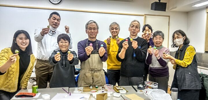 昨日(18日)、大東文化会館で東京サークル1月例会を行いました。オンライン参加も含め12人で、難教材「テープ巻き逆立ちゴマ」に取り組みました。うまくいけば今年の全国大会・実技講座の一つに、と目論んでいたのですが、成功率約50%でしたので、実技講座は断念。手作り市の「展示」に回すことにしました。難教材だけに、見事に逆立ちして回った時の嬉しさは格別!